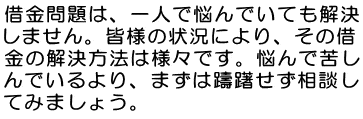 多重債務者問題の解決にはまず、借金を抱えている債務者自身が早い段階で適切な窓口へ相談をして、債務整理などの法的解決や生活再建に向けて一歩を踏み出すことが何より大切です。そして、当事者が再び多重債務状態に陥ることなく、自立した生活を営んで行かれるよう支援していくことが重要であると考えております。